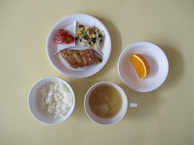 ・ごはん ・鮭のムニエル ・ソーセージフライ ・のり酢和え ・オレンジ ・味噌汁