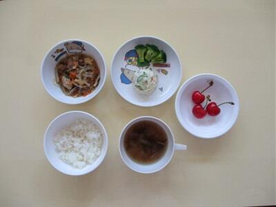 ・ごはん ・鶏肉の照り焼き ・ひじきの煮物 ・ごぼうサラダ ・さくらんぼ ・具沢山汁