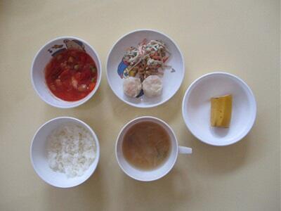 ・ごはん ・チリコンカン ・ツナ和え ・さつま芋甘煮 ・甘夏 ・すまし汁
