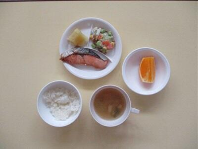・ごはん ・鮭の照り焼き ・さつまいもの甘煮 ・納豆サラダ ・オレンジ ・みそ汁