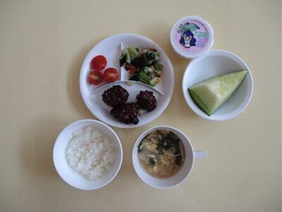 ・ごはん ・ミートボール ・県民の日ゼリー ・ミニトマト ・なめ茸和え ・メロン ・かんぴょうのみそ汁