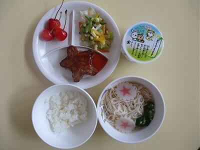 ・ごはん ・星型ハンバーグ ・七夕ゼリー ・キャベツのイタリアンサラダ ・さくらんぼ ・そうめん汁
