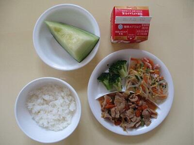 ・ごはん ・回鍋肉 ・ブロッコリー ・バンサンスー ・メロン ・牛乳