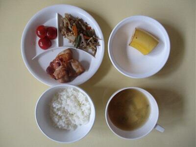 ・ごはん ・鶏肉のかりん揚げ ・ミニトマト ・五目豆 ・オレンジ ・味噌汁