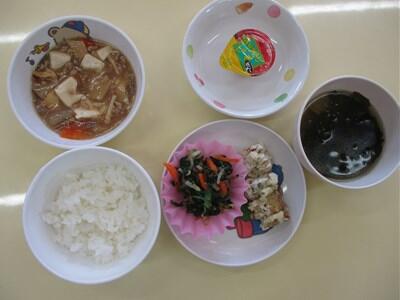 ・ごはん ・ほっけの西京焼き ・厚揚げと野菜の麻婆炒め ・ウインナー ・青りんごゼリー ・牛乳
