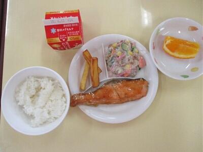 ・ごはん ・鮭の照り焼き ・納豆サラダ ・おさつフライ ・オレンジ ・牛乳