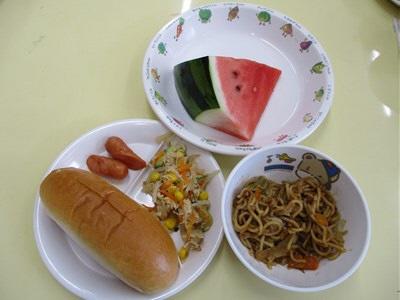 ・コッペパン ・焼きそば ・ウインナー ・棒々鶏サラダ ・スイカ ・牛乳