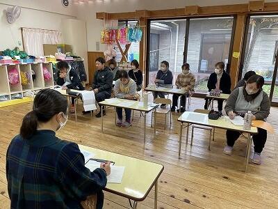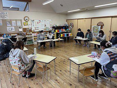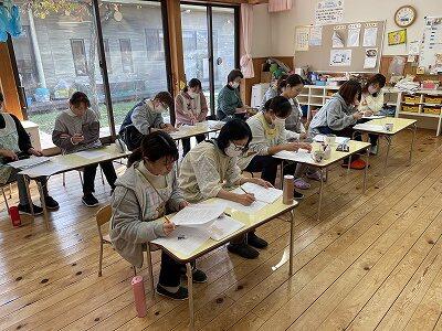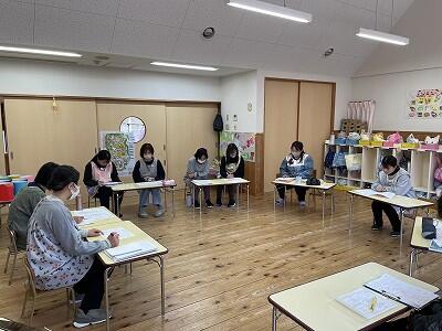 みかん組担任から今日の保育の振り返りを聞いたあと、参観しての子どもの姿や学び、保育者との関わりなどについて話し合いをしました。