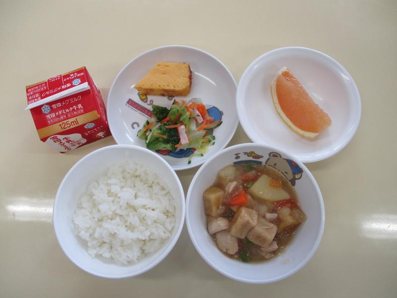 ・ごはん ・高野豆腐のオラン煮 ・厚焼き玉子 ・ブロッコリーサラダ ・グレープフルーツ ・牛乳