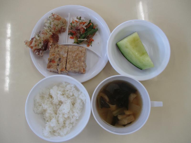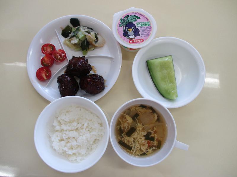 ・ごはん ・ミートボール ・なめ茸和え ・ミニトマト ・かんぴょうのみそ汁 ・メロン ・県民の日ゼリー