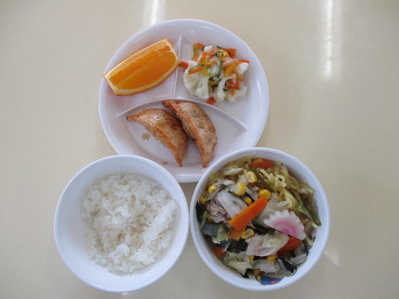 ・ごはん ・揚げ餃子の甘酢あんかけ ・カリフラワーサラダ ・塩野菜ラーメン
