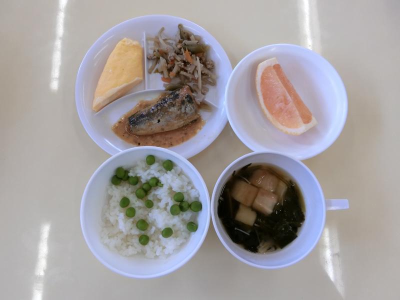 ・ピースごはん ・いわしのごま味噌煮 ・金平ごぼう ・チーズオムレツ ・グレープフルーツ ・みそ汁