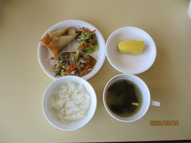 ・ごはん ・ピーマンの細切り炒め ・春巻き ・キャベツのナムル ・バナナ ・みそ汁