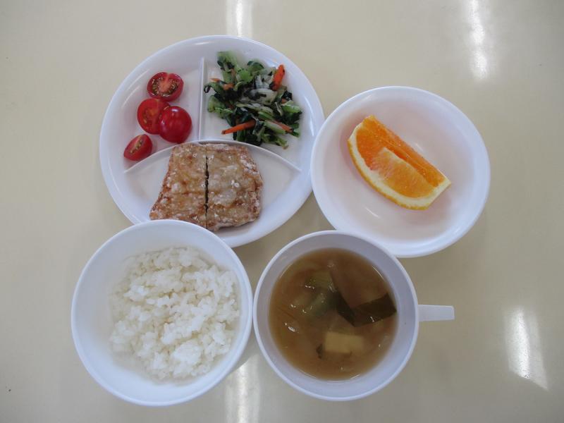 ・ごはん ・モロの竜田揚げ ・磯辺揚げ ・ミニトマト ・オレンジ ・みそ汁