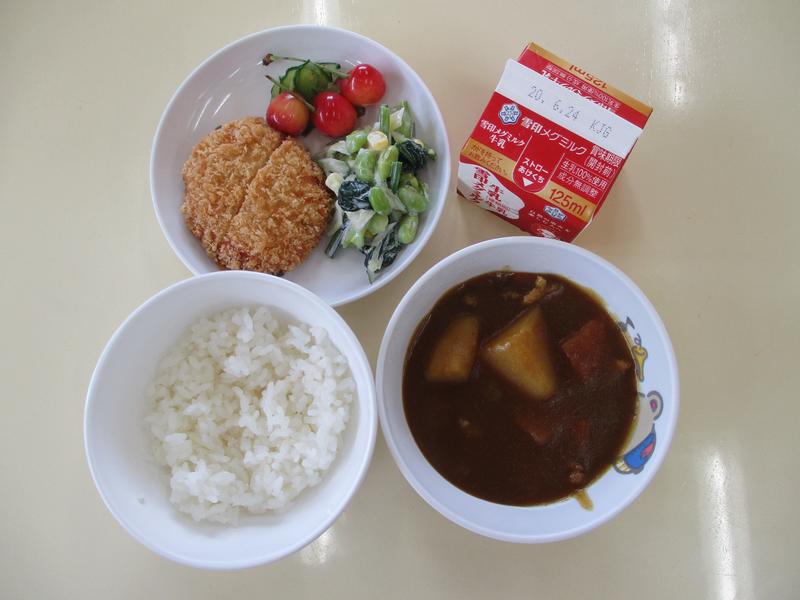 ・ごはん ・ポークカレー ・エビカツ ・グリーンサラダ ・さくらんぼ ・牛乳