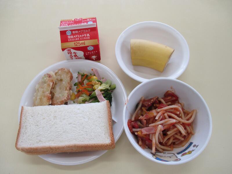 ・ツナサンド ・ナスとトマトのスパゲティ ・豆腐ナゲット ・コーンサラダ ・バナナ ・牛乳