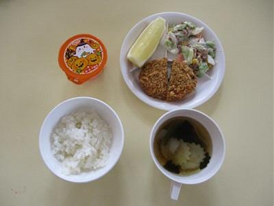 ・ごはん ・かぼちゃのコロッケ ・納豆サラダ ・すまし汁 ・ハロウィンババロア ・グレープフルーツ ・すまし汁