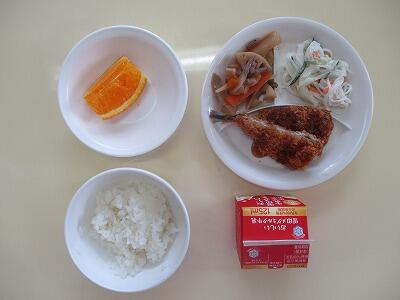 ・ごはん ・アジフライ ・根菜のきんぴら ・シルバーサラダ ・オレンジ ・牛乳