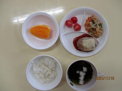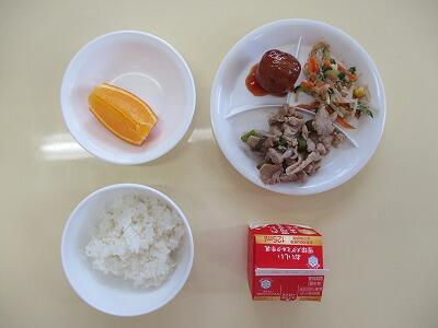 ・ごはん ・チーズハンバーグ ・こぎつねサラダ ・ミニトマト ・オレンジ ・すまし汁