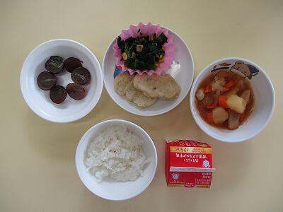 ・ごはん ・インド煮 ・豆腐ナゲット ・ほうれん草のソテー ・ぶどう ・牛乳