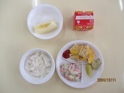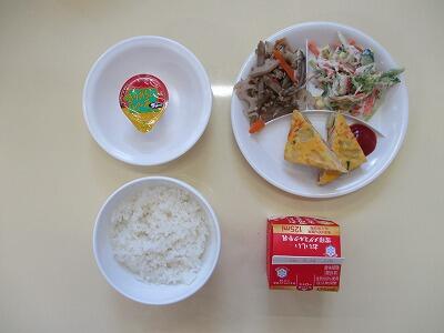 ・ごはん ・スパニッシュオムレツ ・カニ風味サラダ ・栄養きんぴら ・ミニゼリー ・牛乳