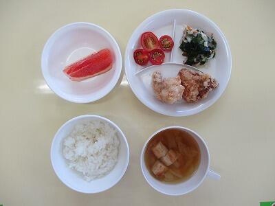 ・ごはん ・鶏肉のから揚げ ・小松菜のごまマヨ和え ・トマト ・りんご ・わかめスープ