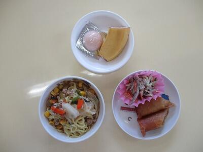 ・チョコパン ・ツナマヨオムレツ ・ハムのマリネ ・ナポリタン ・ミニゼリー ・牛乳