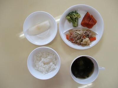 ・ごはん ・プルコギ風野菜炒め ・かぼちゃの甘煮 ・ブロッコリー ・梨 ・みそ汁