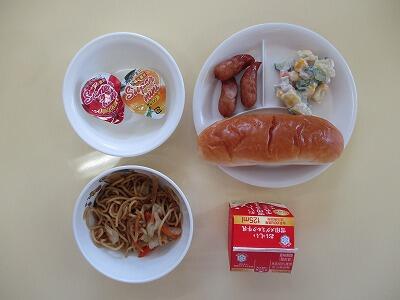・コッペパン ・焼きそば ・さつまいもサラダ ・ウインナー ・ミニゼリー ・牛乳