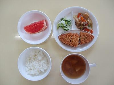 ・ごはん ・鮭フライ ・厚揚げの煮物 ・即席漬け ・グレープフルーツ ・みそ汁