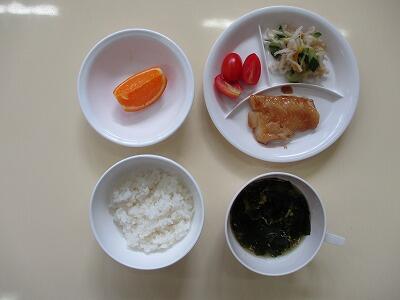 ・ごはん ・鮭のムニエル ・ジャーマンポテト ・ブロッコリー ・りんご ・マカロニのクリームスープ
