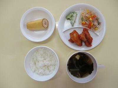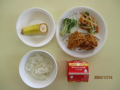 ・ごはん ・鶏肉のコーンフレーク焼き ・彩り和え ・ブロッコリー ・バナナ ・牛乳