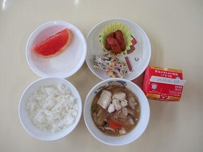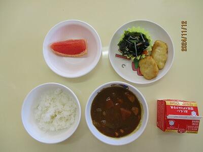 ・ごはん ・チキンカレー ・春雨の酢の物 ・ナゲット ・グレープフルーツ ・牛乳