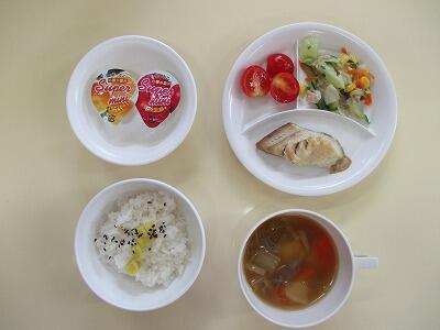・ごはん ・アジの好味焼き ・チーズサラダ ・ミニトマト ・グレープフルーツ ・豚汁