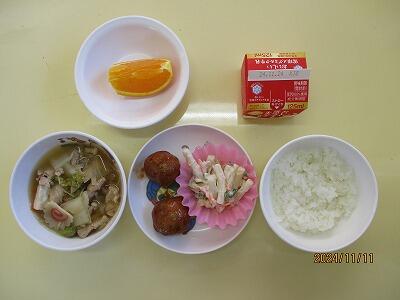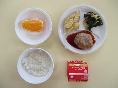 ・ごはん ・鶏つくね ・ひじきの煮物 ・なめ茸和え ・オレンジ ・牛乳