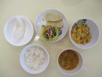 ・ごはん ・千草焼き ・もやしの和え物 ・チキンナゲット ・梨 ・牛乳