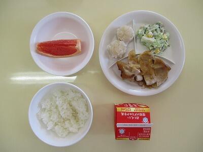 ・ごはん ・油淋鶏 ・キャベツサラダ ・かにしゅうまい ・グレープフルーツ ・牛乳