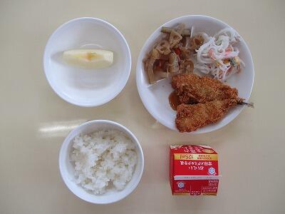 ・ごはん ・アジフライ ・根菜のきんぴら ・シルバーサラダ ・りんご ・牛乳