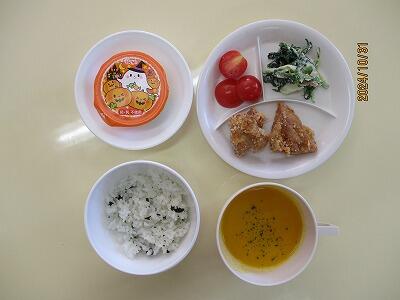・わかめごはん ・鶏肉のから揚げ ・ほうれん草のサラダ ・ミニトマト ・ハロウィンババロア ・パンプキンスープ