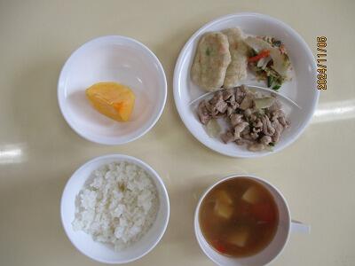 ・ごはん ・ポークジンジャー ・ごま和え ・豆腐ナゲット ・柿 ・いものこ汁