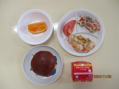 ・黒糖ロール ・ポテトグラタン ・ごぼうサラダ ・トマト ・オレンジ ・牛乳