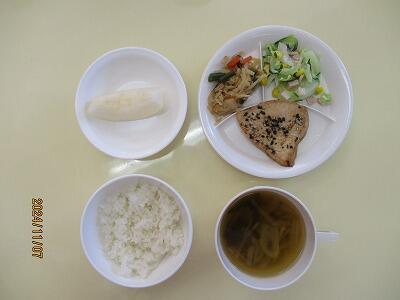 ・ごはん ・カレイの照り焼き ・春雨サラダ ・ブロッコリー ・バナナ ・礒香汁