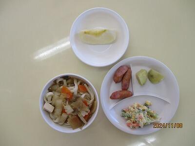 ・けんちんうどん ・さつまいもの甘煮 ・卵サラダ ・ウインナー ・りんご