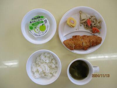 ・わかめうどん ・ささみフライ ・おかか和え ・かぼちゃの甘煮 ・ぶどうゼリー