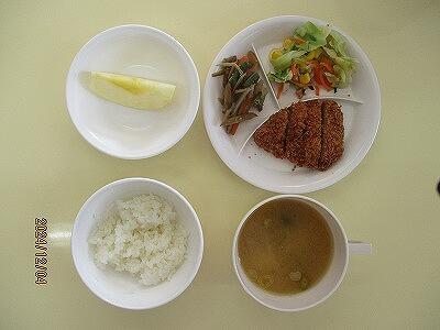 ・ごはん ・ひれかつ ・きんぴら ・キャベツサラダ ・りんご ・なめこ汁
