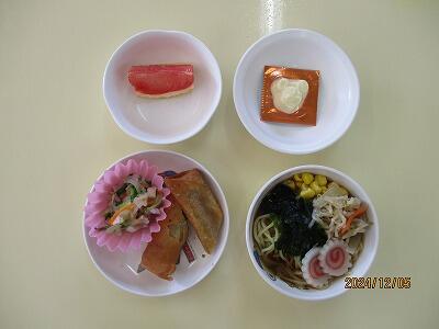 ・肉うどん ・コーンコロッケ ・なめ茸和え ・レアチーズイチゴ ・デコポン