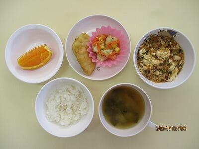 ・ごはん ・麻婆豆腐 ・コールスローサラダ ・ナゲット ・オレンジ ・みそ汁