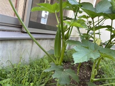 中庭に出ると、「あ~っ!!オクラが!」「あ~っ!!スイカが!」と