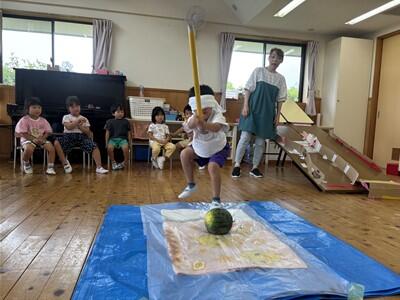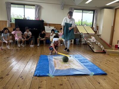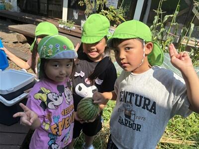 ※たくさん収穫したうちの1個は、1号認定のお友達も呼んで一緒にスイカ割りを楽しみました♪「元気~??」「スイカ食べに来たの~?」と子ども達も久しぶりの再会を喜びました(^^)