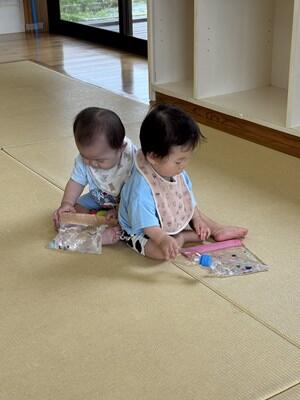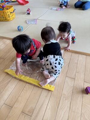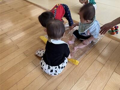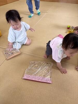 センサリーバック(袋の中に水やスパンコールなどを入れたもの)を用意してあげると、初めは不思議そうに見ていた子どもたち